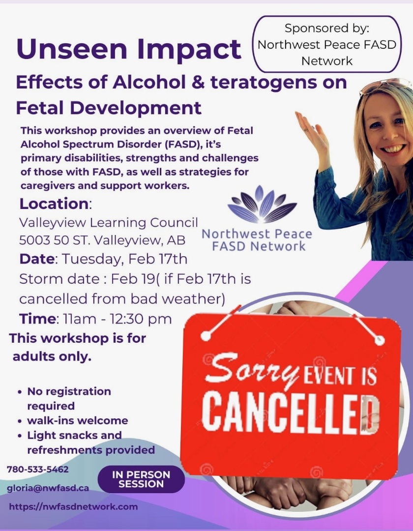 Due to poor weather conditions, today’s Unseen Impact: Effects of Alcohol & Teratogens on Fetal Development workshop at Valleyview Learning Council (5003 50 St., Valleyview, AB) scheduled for 11:00 AM – 12:30 PM has been cancelled.